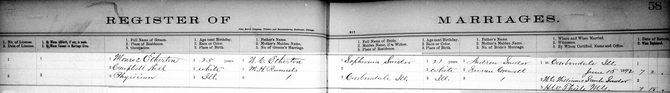 Monroe Etherton & Sophronia Snider Register of MarriageType: