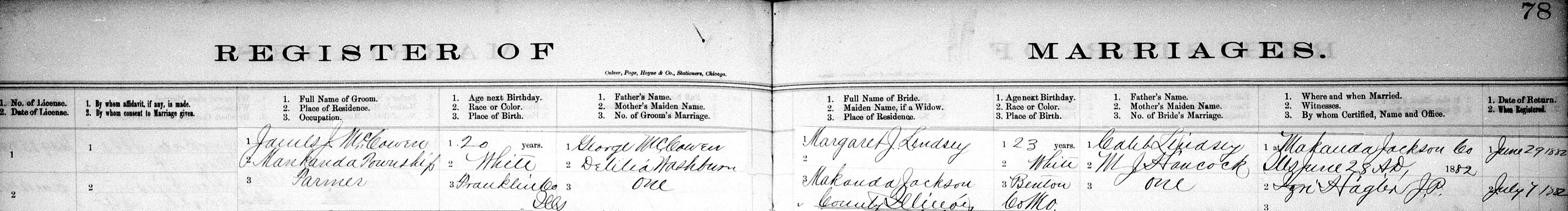 James McCowen & Margaret Lindsey Marriage Register