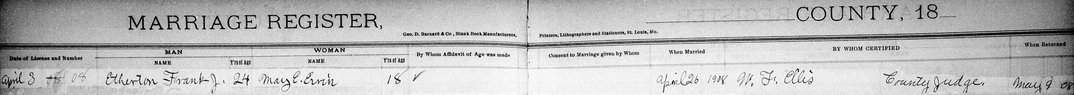 Frank J Etherton & May E Irvin Marriage RegisterType: