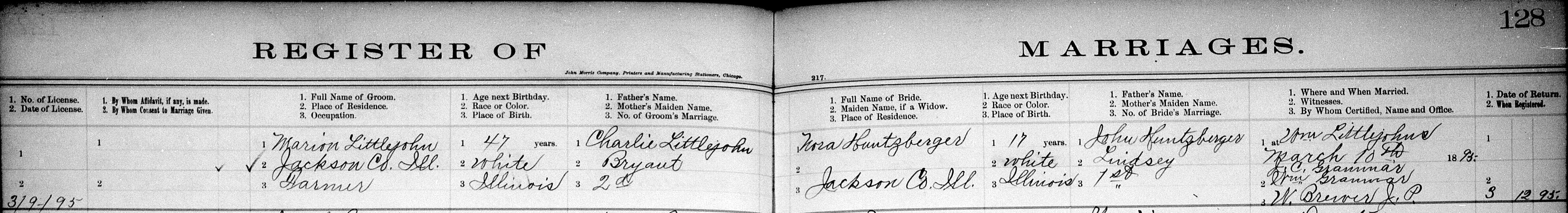 Marion Littlejohn & Nora Huntzberger Register of MarriageType: